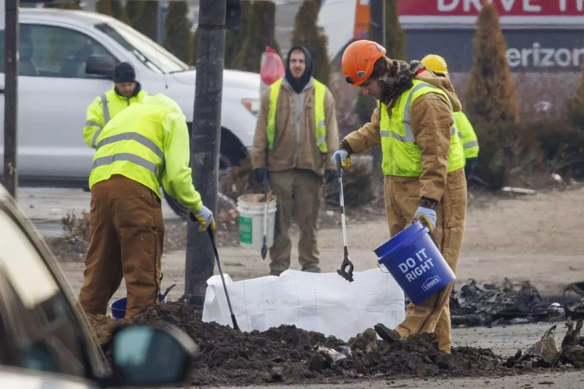 Workers collect debris in the aftermath of a fatal small plane crashed in Philadelphia, Monday, Feb. 3, 2025. (AP Photo/Matt Rourke)