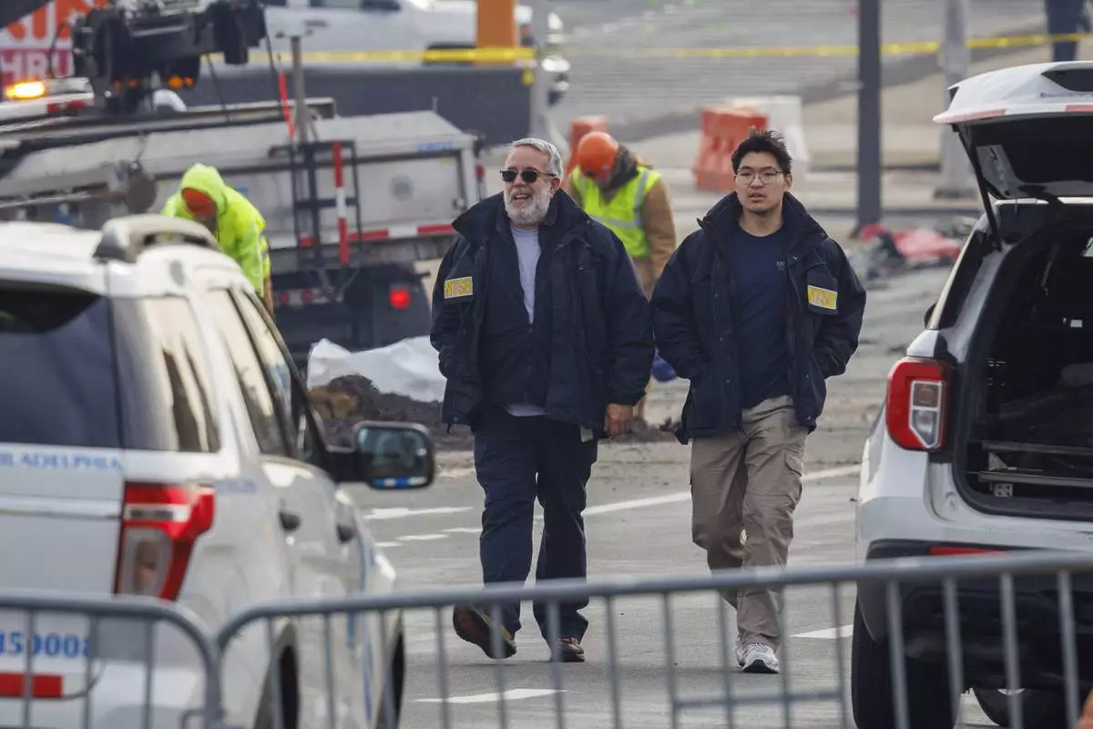NTSB employees walk through the scene of medical jet crash Monday morning Feb. 3, 2025, in Philadelphia. (Alejandro A. Alvarez/The Philadelphia Inquirer via AP)