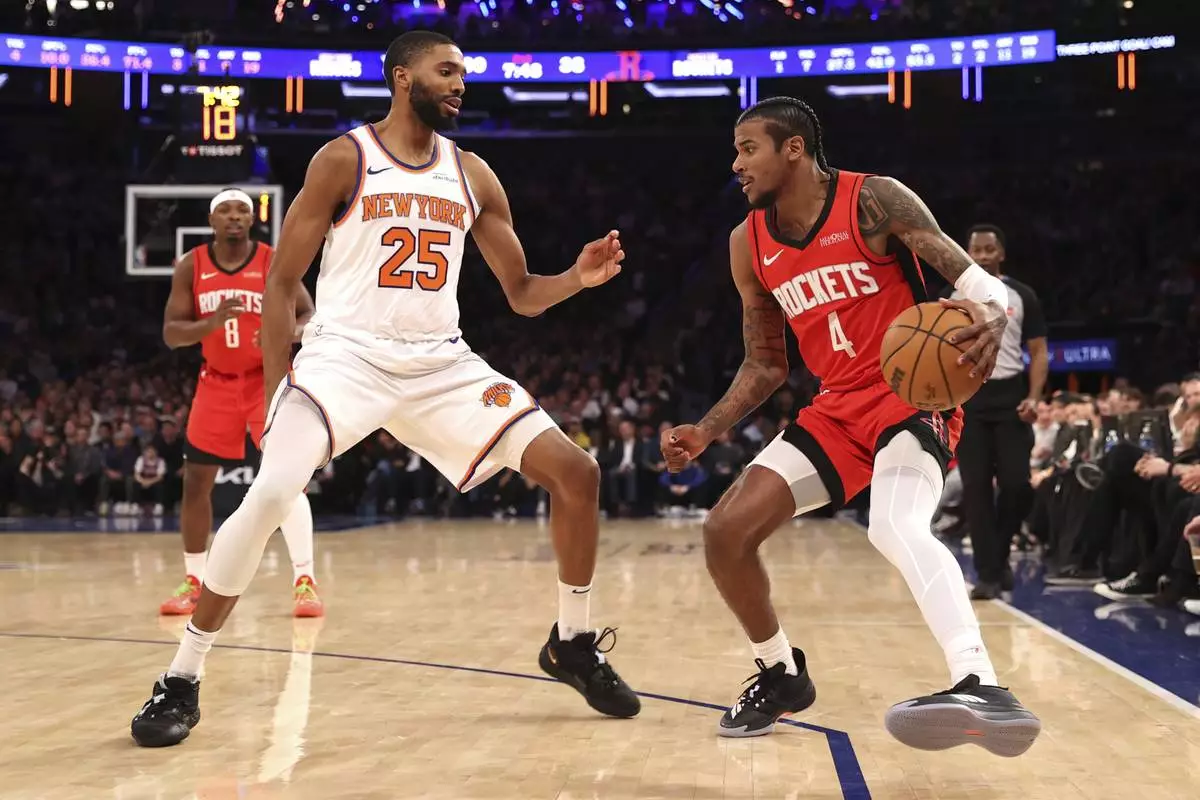 Houston Rockets' Jalen Green (4) dribbles the ball against New York Knicks' Mikal Bridges (25) during the first half of an NBA basketball game Monday, Feb. 3, 2025, in New York. (AP Photo/Pamela Smith)