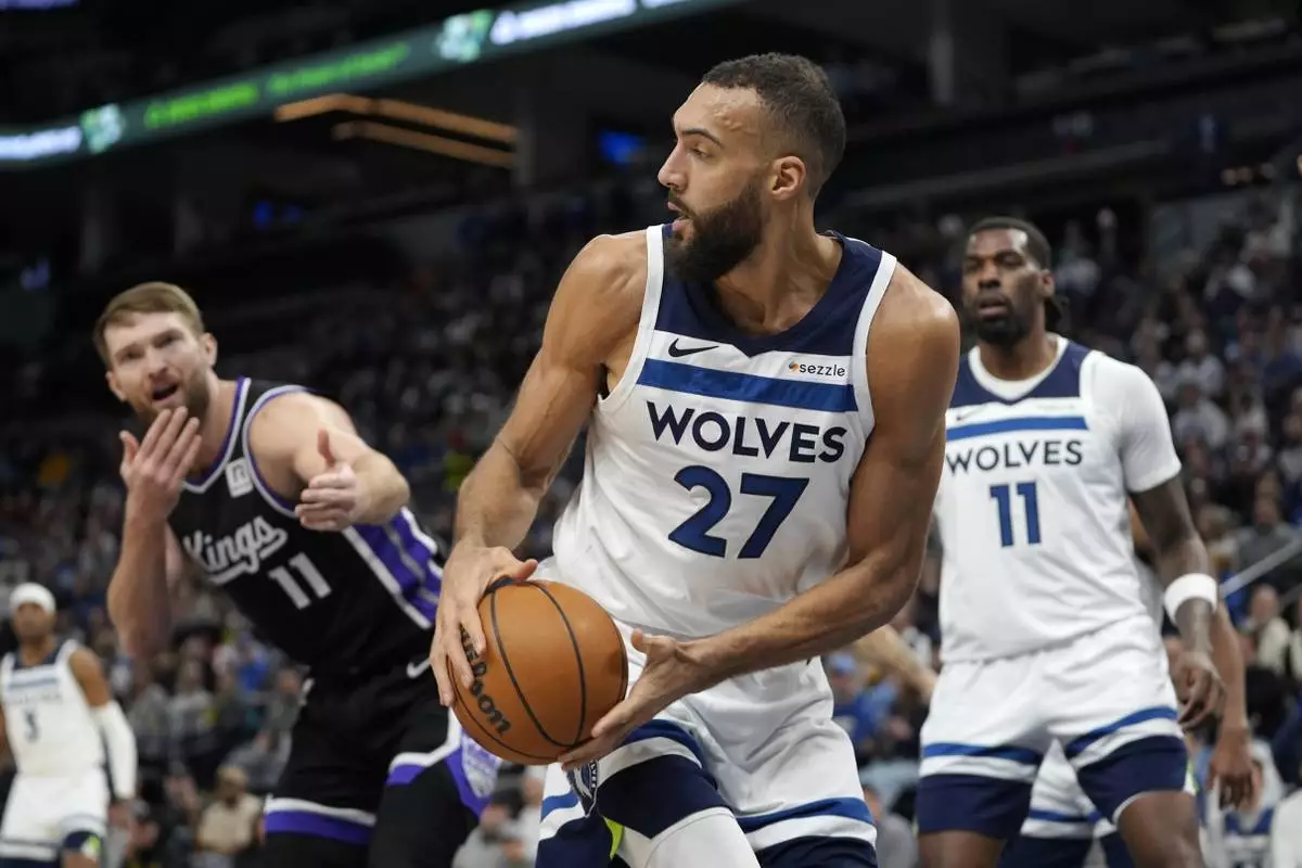 Minnesota Timberwolves center Rudy Gobert (27) grabs a rebound as Sacramento Kings forward Domantas Sabonis, left, reacts after not receiving a foul call during the first half of an NBA basketball game, Monday, Feb. 3, 2025, in Minneapolis. (AP Photo/Abbie Parr)