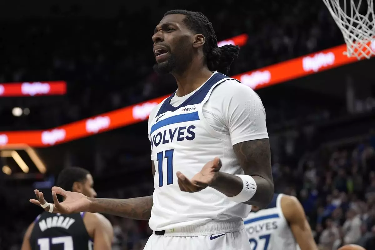 Minnesota Timberwolves center Naz Reid (11) reacts after being called for a foul during the first half of an NBA basketball game against the Sacramento Kings, Monday, Feb. 3, 2025, in Minneapolis. (AP Photo/Abbie Parr)