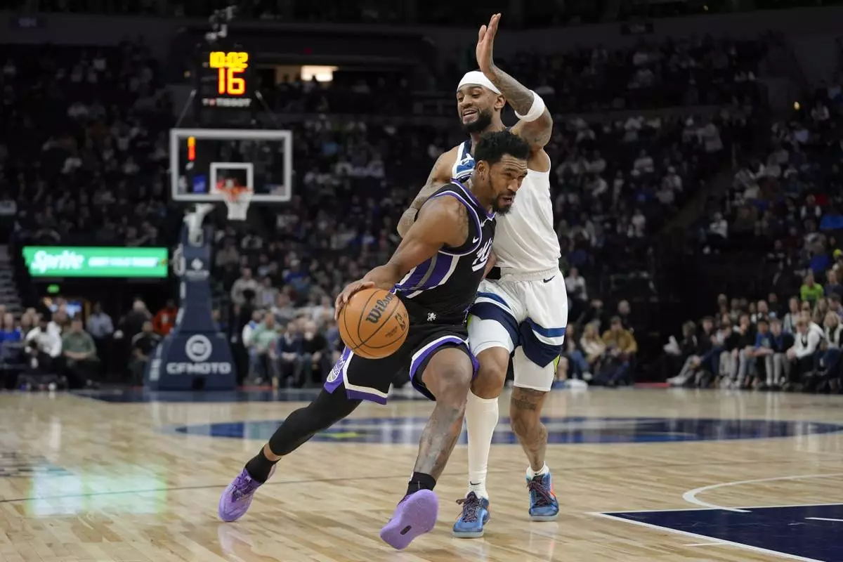 Sacramento Kings guard Malik Monk, left, works toward the basket as Minnesota Timberwolves guard Nickeil Alexander-Walker defends during the first half of an NBA basketball game Monday, Feb. 3, 2025, in Minneapolis. (AP Photo/Abbie Parr)