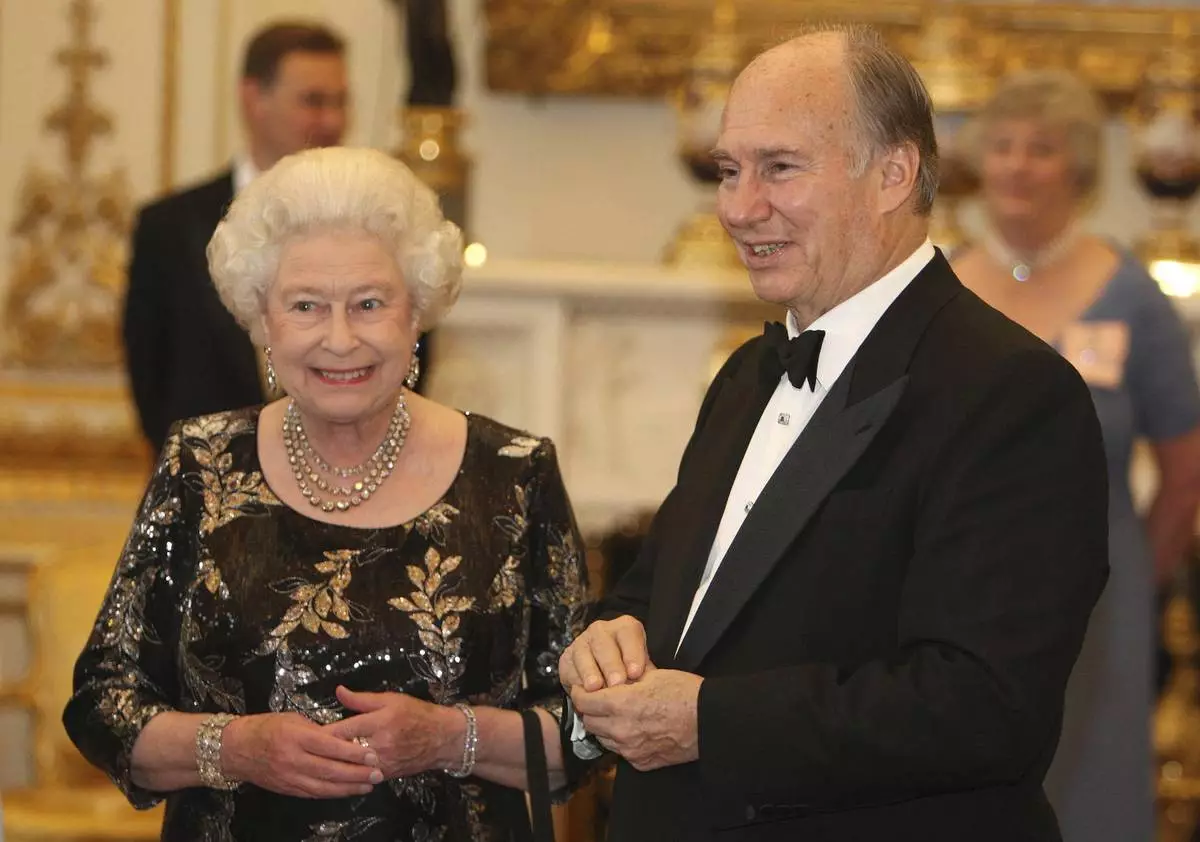 FILE - Queen Elizabeth II and The Aga Khan at a dinner at Buckingham Palace, in London, July 7, 2008, to mark the Aga Khan's Golden Jubilee. (Dominic Lipinski/PA via AP, File)