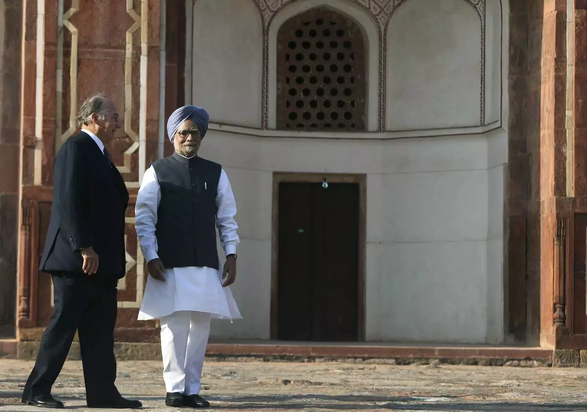 FILE - Indian Prime Minister Manmohan Singh, right, walks with the Aga Khan, spiritual head of Ismaili Muslims, as he arrives to inaugurate the restored 16th Century Humayun's Tomb in New Delhi, India, Wednesday, Sept. 18, 2013. (AP Photo/Manish Swarup, File)