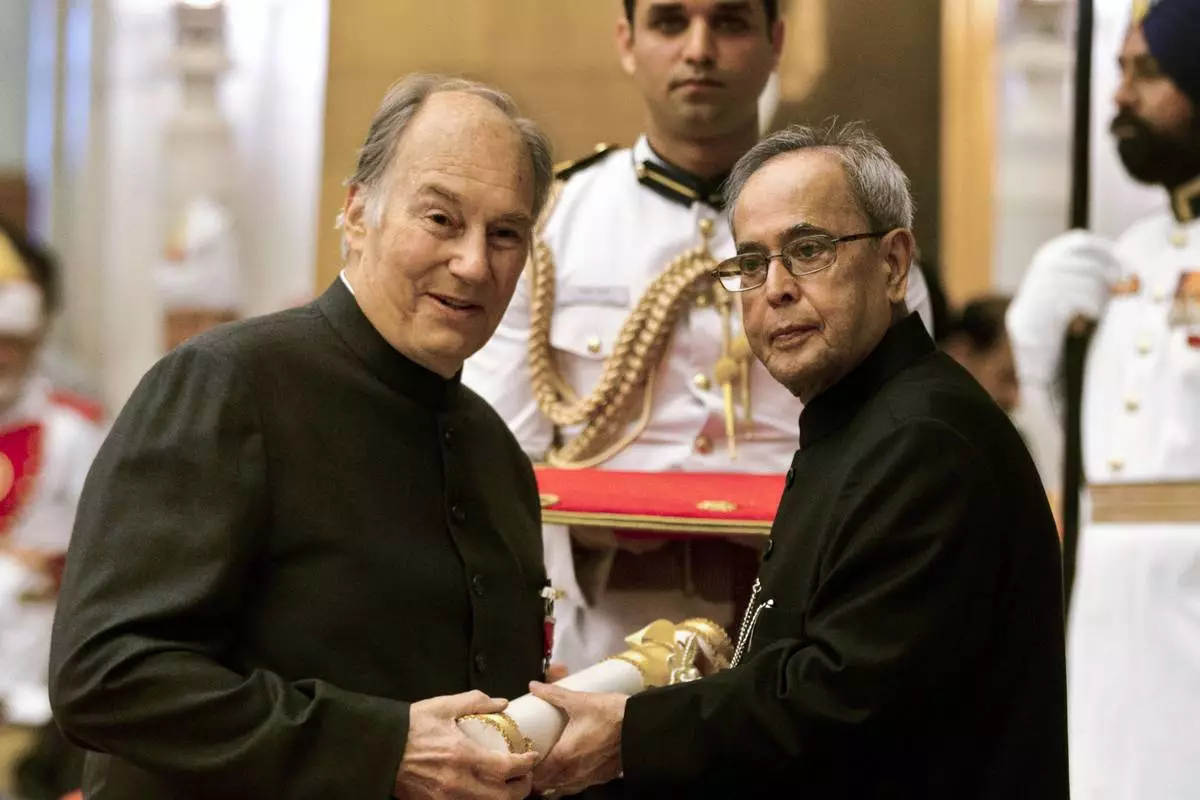 FILE - Indian President Pranab Mukherjee confers the Padma Vibhushan to the Aga Khan, spiritual head of Ismaili Muslims, left, during a civil investiture ceremony at the presidential palace in New Delhi, India, Wednesday, April 8, 2015. The Padma Vibhushan is the second highest civilian award in India. (AP Photo/Manish Swarup, File)