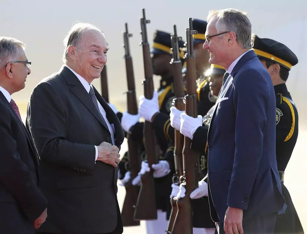 FILE - The Aga Khan, spiritual head of Ismaili Muslims, leaves after the inauguration of the restored 16th century Humayun's Tomb in New Delhi, India, Wednesday, Sept. 18, 2013. (AP Photo/Manish Swarup, File)