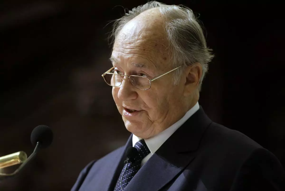 FILE - The Aga Khan, spiritual leader to millions of Muslim, addresses an audience, Thursday, Nov. 12, 2015, at the Memorial Church on the campus of Harvard University in Cambridge, Mass. (AP Photo/Steven Senne, File)