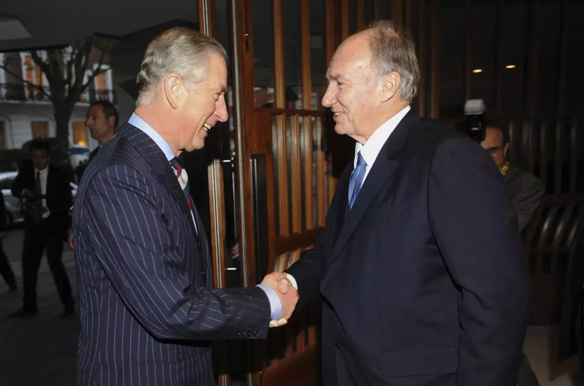 FILE - The Prince of Wales, now King Charles III, is greeted by the Aga Khan, right, during a visit to the Ismaili Centre to join a reception to help celebrate their 25th anniversary, in London, Nov. 18, 2010. (Anthony Devlin/PA via AP, File)