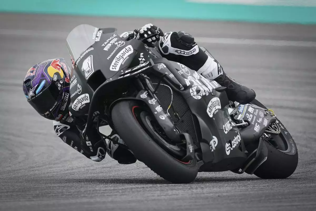 Aprilia Racing's Spanish rider Jorge Martin takes a turn during the first day of the 2025 MotoGP pre-season test at the Sepang International Circuit in Sepang, Malaysia, Wednesday, Feb. 5, 2025. (AP Photo/Kien Huo)