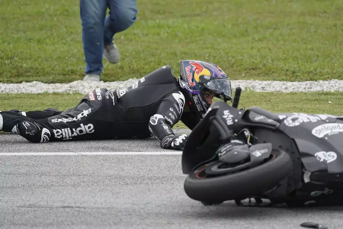 Aprilia Racing's Spanish rider Jorge Martin crashes on second corner during the first day of the 2025 MotoGP pre-season test at the Sepang International Circuit in Sepang, Malaysia, Wednesday, Feb. 5, 2025. (AP Photo/Kien Huo)
