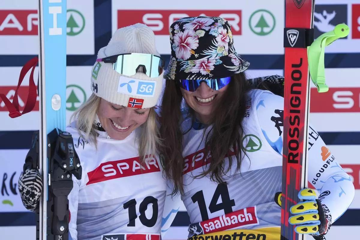 United States' Lauren Macuga, left, and Norway's Kajsa Vickhoff Lie show their joint bronze medals in a women's Super-G, at the Alpine Ski World Championships, in Saalbach-Hinterglemm, Austria, Thursday, Feb. 6, 2025. (AP Photo/Gabriele Facciotti)