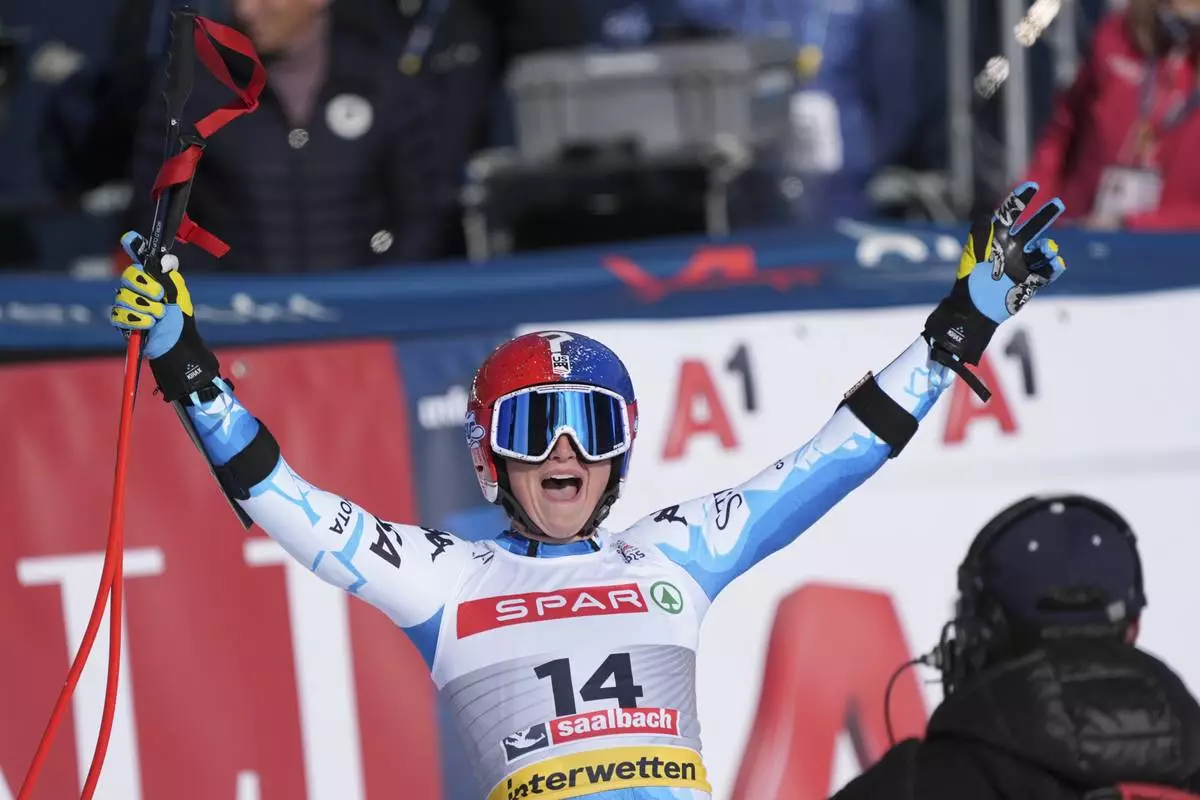 United States' Lauren Macuga celebrates at the finish area of a women's Super-G, at the Alpine Ski World Championships, in Saalbach-Hinterglemm, Austria, Thursday, Feb. 6, 2025. (AP Photo/Giovanni Auletta)