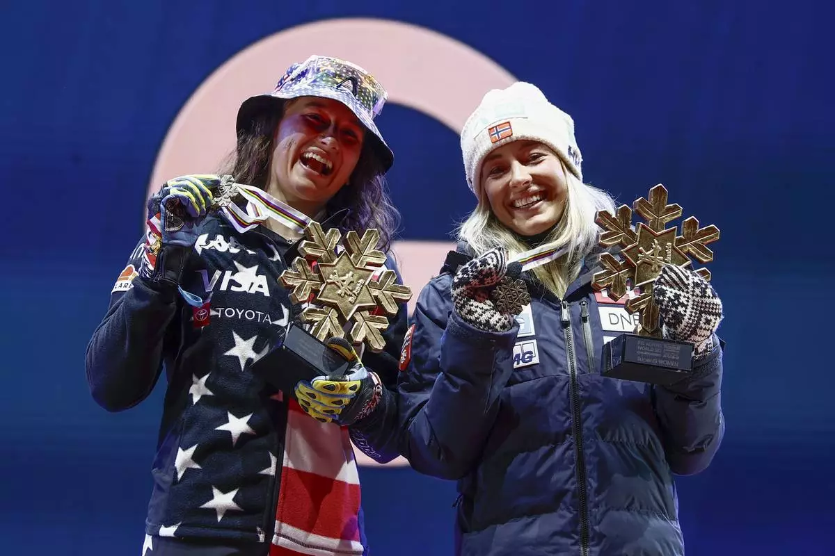 United States' Lauren Macuga, left, and Norway's Kajsa Vickhoff Lie show their joint bronze medal in a women's Super-G, at the Alpine Ski World Championships, in Saalbach-Hinterglemm, Austria, Thursday, Feb. 6, 2025. (AP Photo/Gabriele Facciotti)