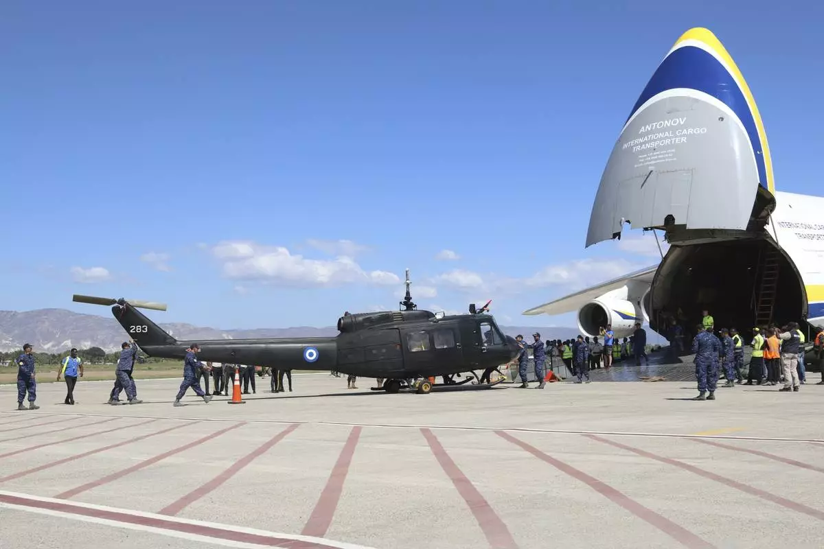 U.N backed Salvador police force unloads a helicopter carrying material for the Multinational Security Support (MSS) mission after the arrival of a Kenyan police contingent, at the Toussaint Louverture International Airport in Port-au-Prince, Haiti, Thursday, Feb. 6, 2025. (AP Photo/Odelyn Joseph)