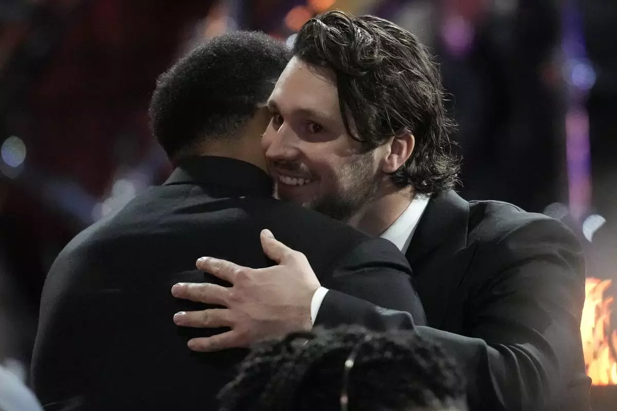 Buffalo Bills' Josh Allen, right, hugs Cleveland Browns' Myles Garrett during the NFL Honors award show ahead of the Super Bowl 59 football game, Thursday, Feb. 6, 2025, in New Orleans. (AP Photo/David J. Phillip)