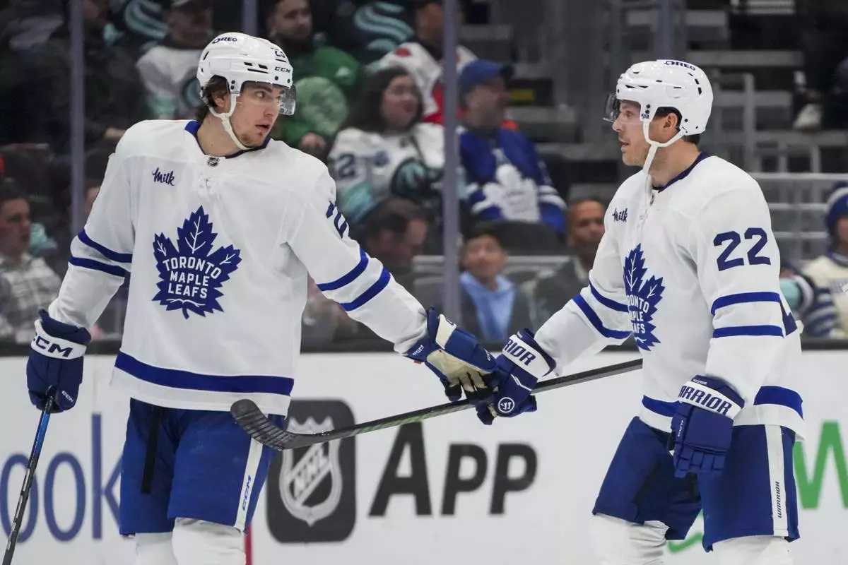 Toronto Maple Leafs left wing Matthew Knies, left, celebrates his goal with defenseman Jake McCabe, right, during the second period of an NHL hockey game against the Seattle Kraken Thursday, Feb. 6, 2025, in Seattle. (AP Photo/Lindsey Wasson)