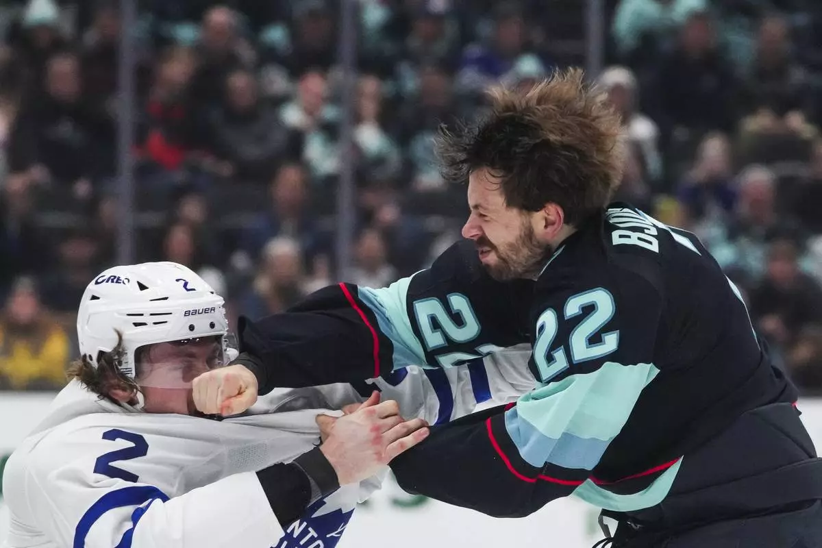 Toronto Maple Leafs defenseman Simon Benoit, left, gets punched by Seattle Kraken right wing Oliver Bjorkstrand, right, as they fight during the second period of an NHL hockey game Thursday, Feb. 6, 2025, in Seattle. (AP Photo/Lindsey Wasson)