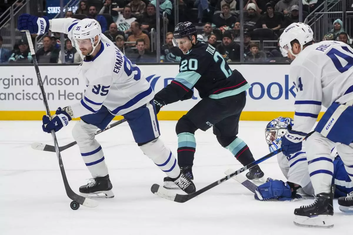 Toronto Maple Leafs defenseman Oliver Ekman-Larsson, left, clears the puck against Seattle Kraken right wing Eeli Tolvanen (20) as Maple Leafs goaltender Anthony Stolarz and defenseman Morgan Rielly, right, look on during the second period of an NHL hockey game Thursday, Feb. 6, 2025, in Seattle. (AP Photo/Lindsey Wasson)