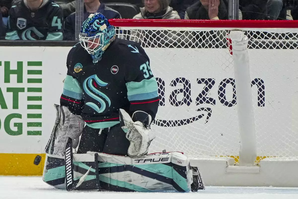 FILE - Seattle Kraken goaltender Joey Daccord makes a save during an NHL hockey game, Jan. 18, 2025, in Seattle. (AP Photo/Lindsey Wasson)