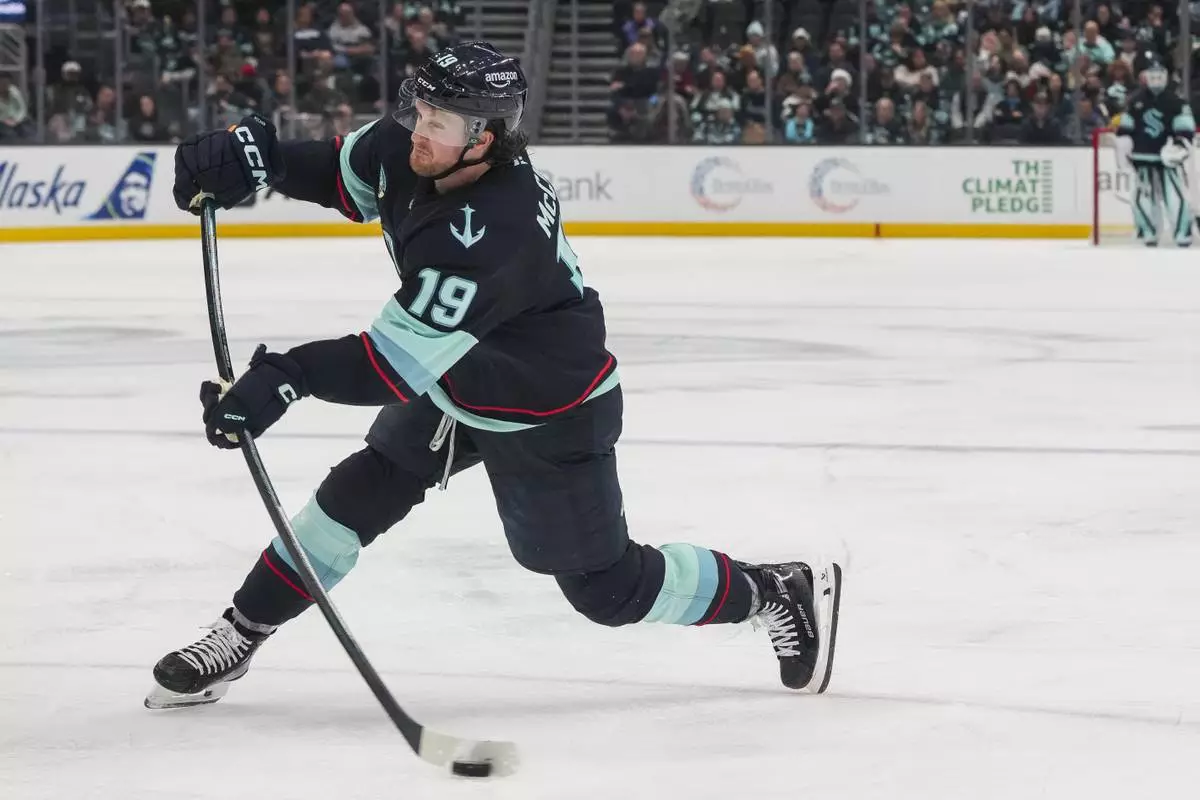 FILE - Seattle Kraken left wing Jared McCann shoots and scores during an NHL hockey game, Nov. 30, 2024, in Seattle. (AP Photo/Lindsey Wasson, File)