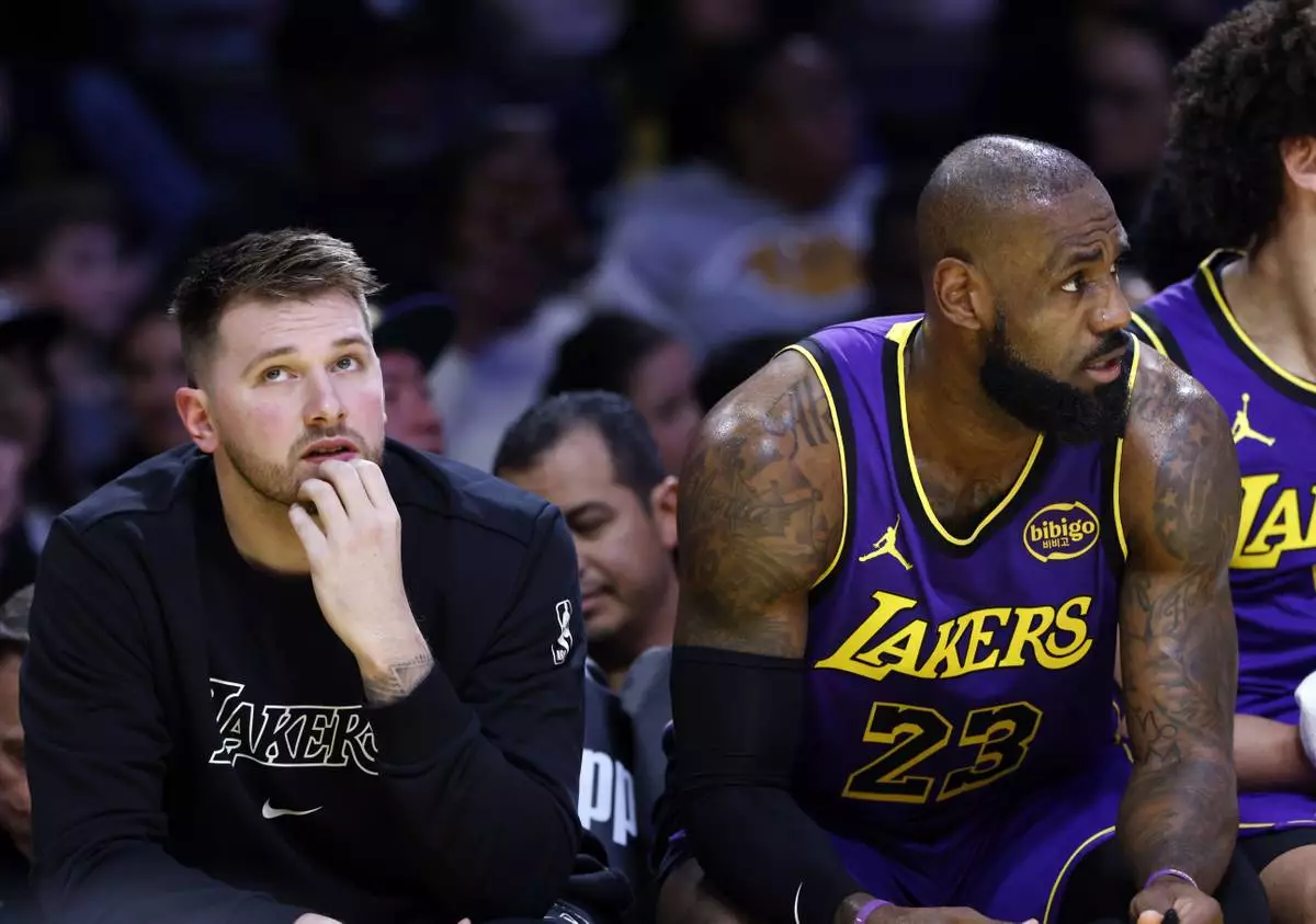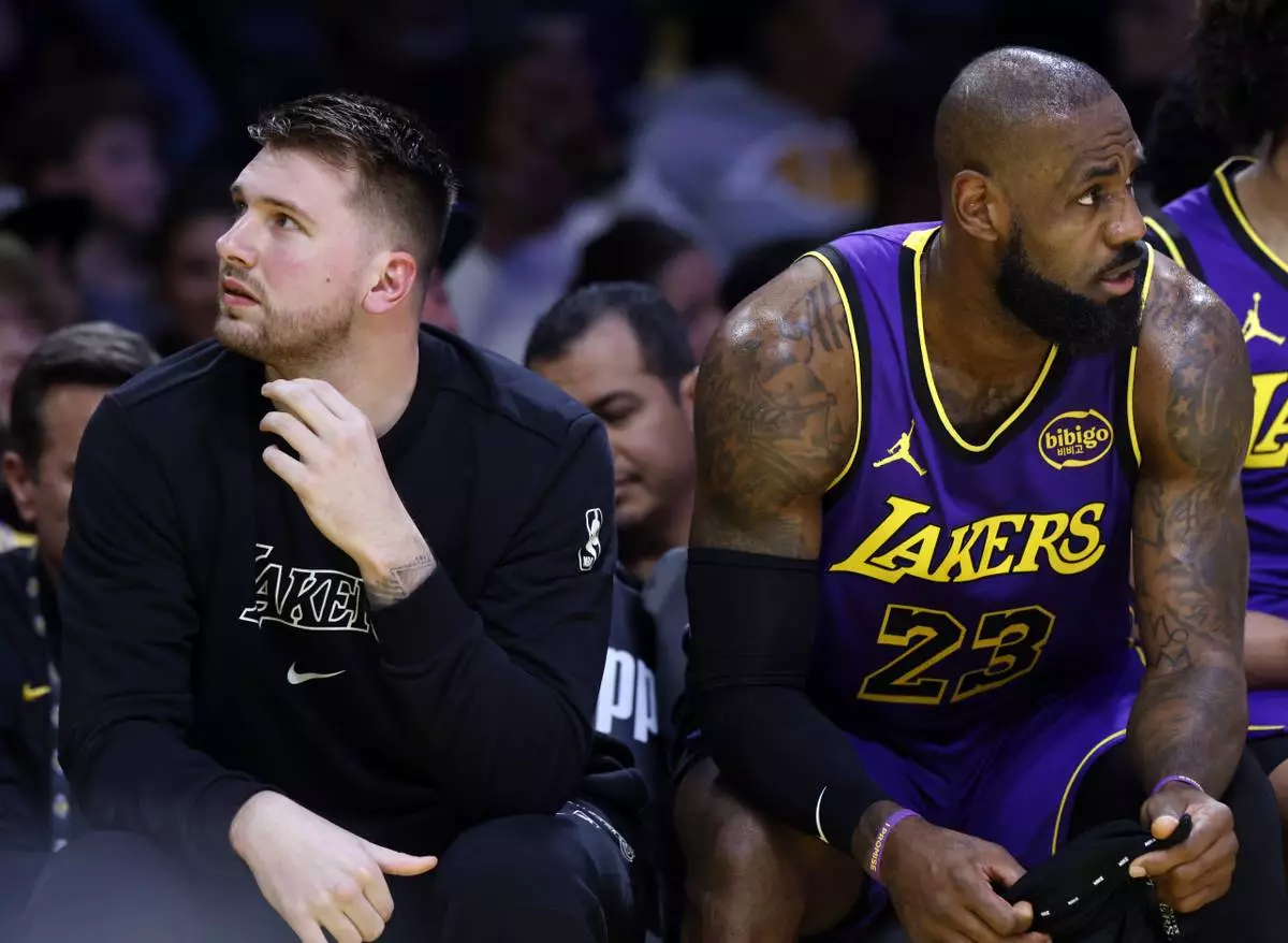 Los Angeles Lakers guard Luka Doncic, left, and forward LeBron James (23) look on from the bench during the first half of an NBA basketball game against the Golden State Warriors, Thursday, Feb. 6, 2025, in Los Angeles. (AP Photo/Kevork Djansezian)