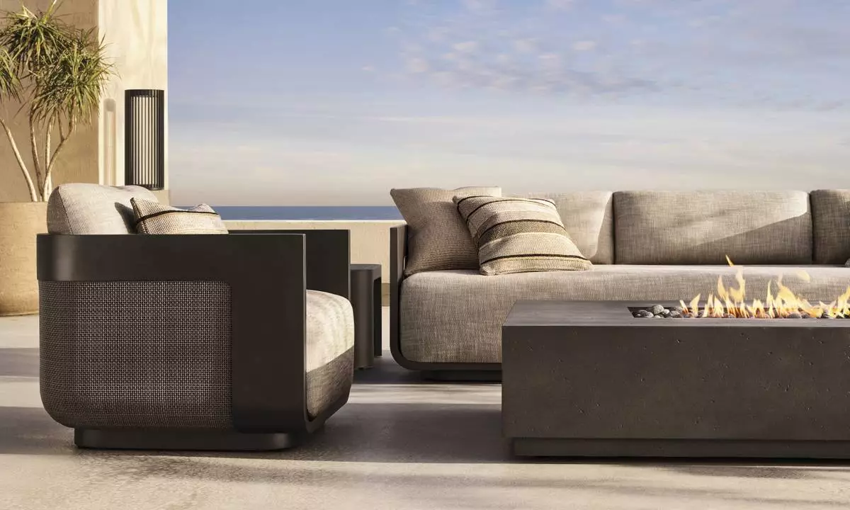 Complementing this season’s offerings is a collection of enduring fire tables. Celebrating fine reeding and fluid curves, Byron Reeded Stone is handcrafted of European travertine and appears almost fluid in nature, seeming to float on a recessed plinth base, while Reeded Plinth, made from weather-resistant composite concrete, brings a refined yet substantial presence to outdoor spaces. Obround, echoing the raw beauty of natural limestone, is crafted from durable, glass-fiber-reinforced concrete, offering strength and longevity in a bold, architectural silhouette.