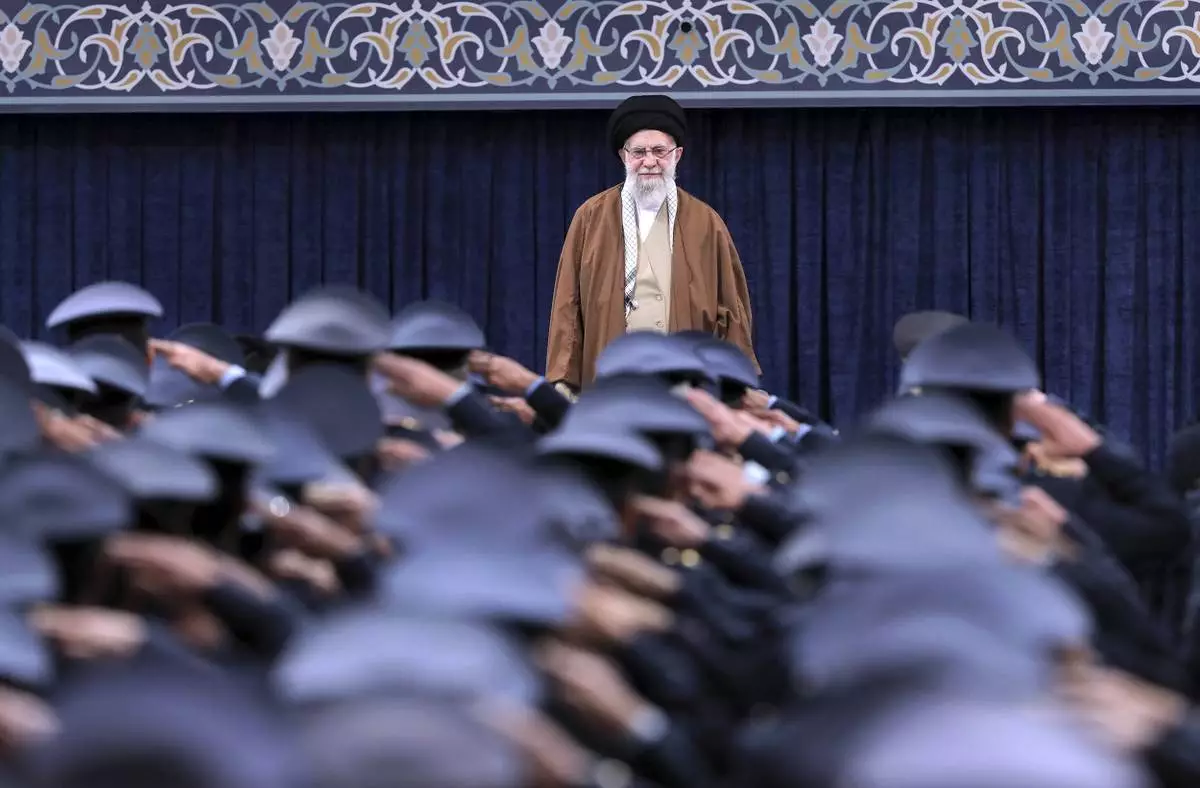 In this photo released by an official website of the office of the Iranian supreme leader, Supreme Leader Ayatollah Ali Khamenei listens to the national anthem as air force officers salute during their meeting in Tehran, Iran, Friday, Feb. 7, 2025. (Office of the Iranian Supreme Leader via AP)