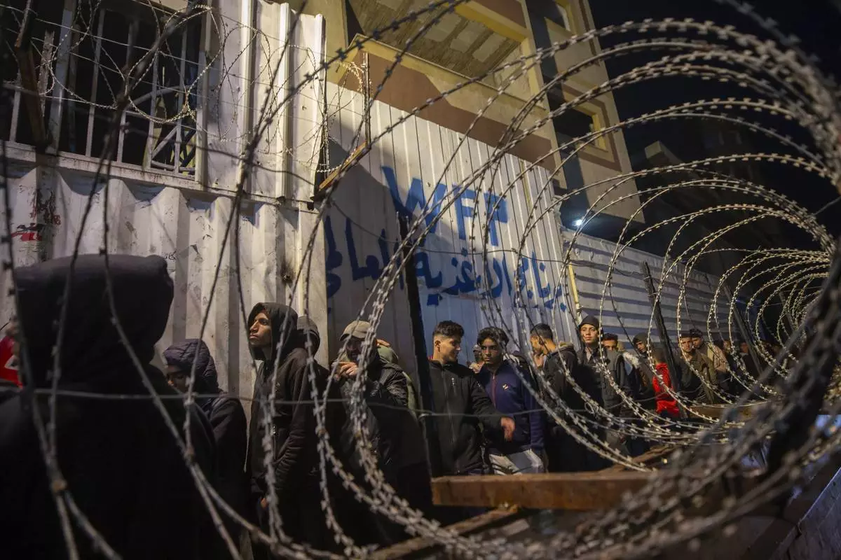 Palestinians wait in line at a World Food Program (WFP) distribution center in Gaza City's Jabalya refugee camp, Thursday, Feb. 6, 2025. (AP Photo/Jehad Alshrafi)