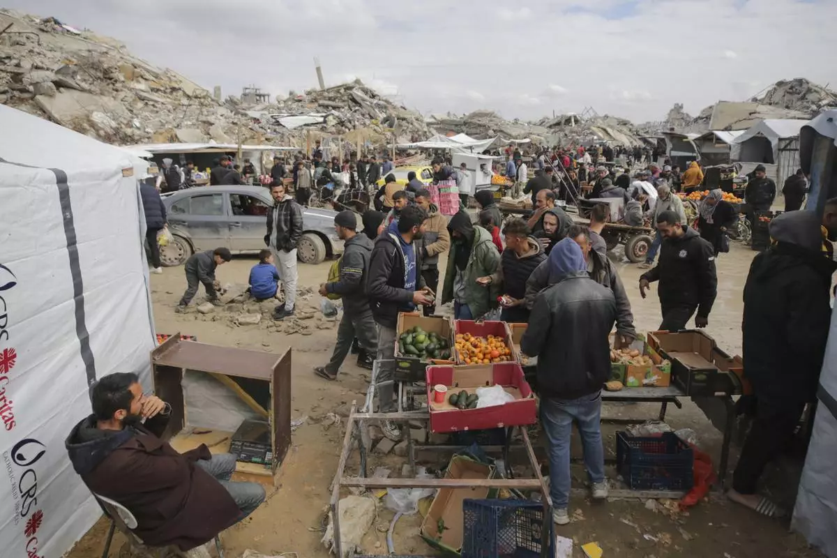 Palestinians purchase goods at a makeshift market set up amid widespread destruction caused by the Israeli military's ground and air offensive in Gaza City's Jabaliya refugee camp, Friday, Feb. 7, 2025. (AP Photo/Jehad Alshrafi)