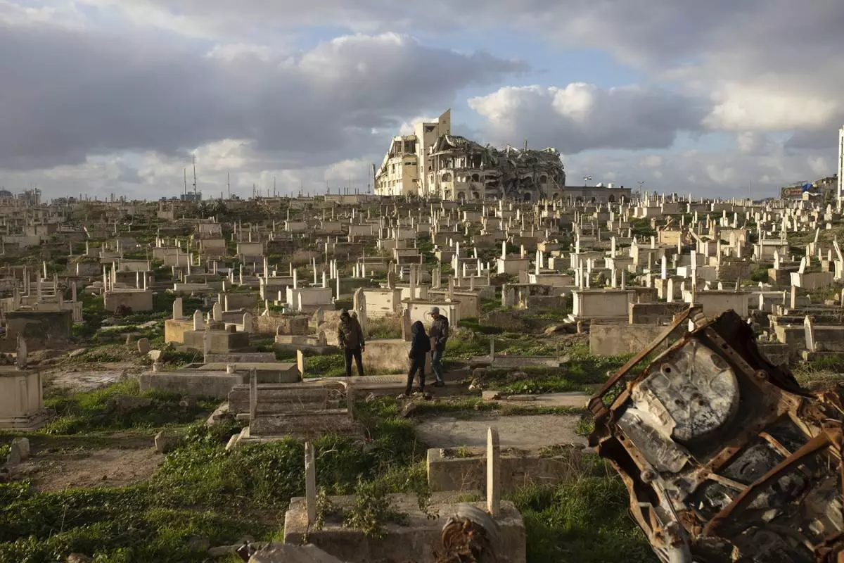 Palestinians visit the grave of a relative at the cemetery in Gaza City Thursday, Feb. 6, 2025, after collecting donated food. (AP Photo/Jehad Alshrafi)
