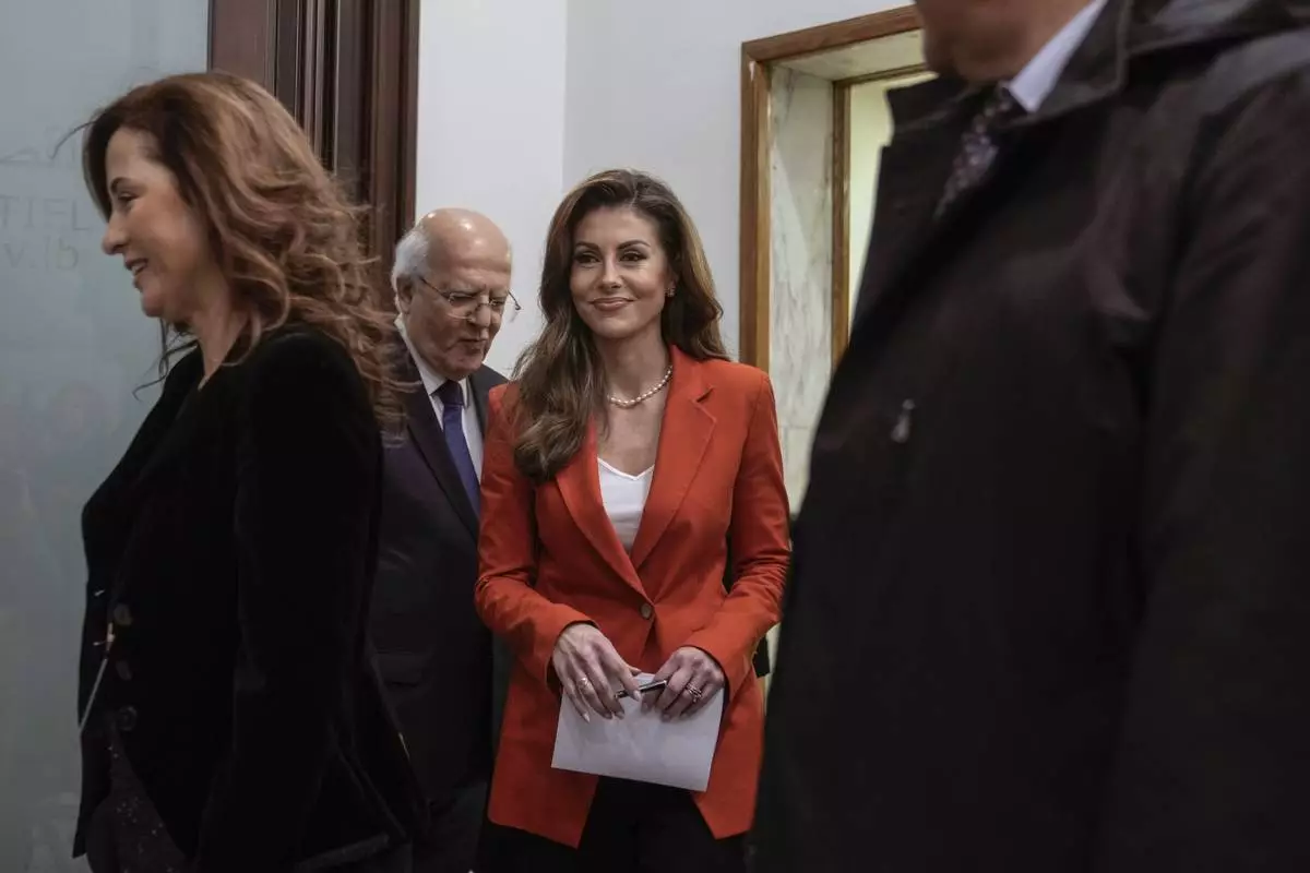 U.S. deputy special envoy for Middle East peace Morgan Ortagus, center, arrives ahead of a press conference after her meeting with Lebanese President Joseph Aoun in Baabda, east of Beirut, Lebanon, Friday, Feb. 7, 2025. (AP Photo/Bilal Hussein)