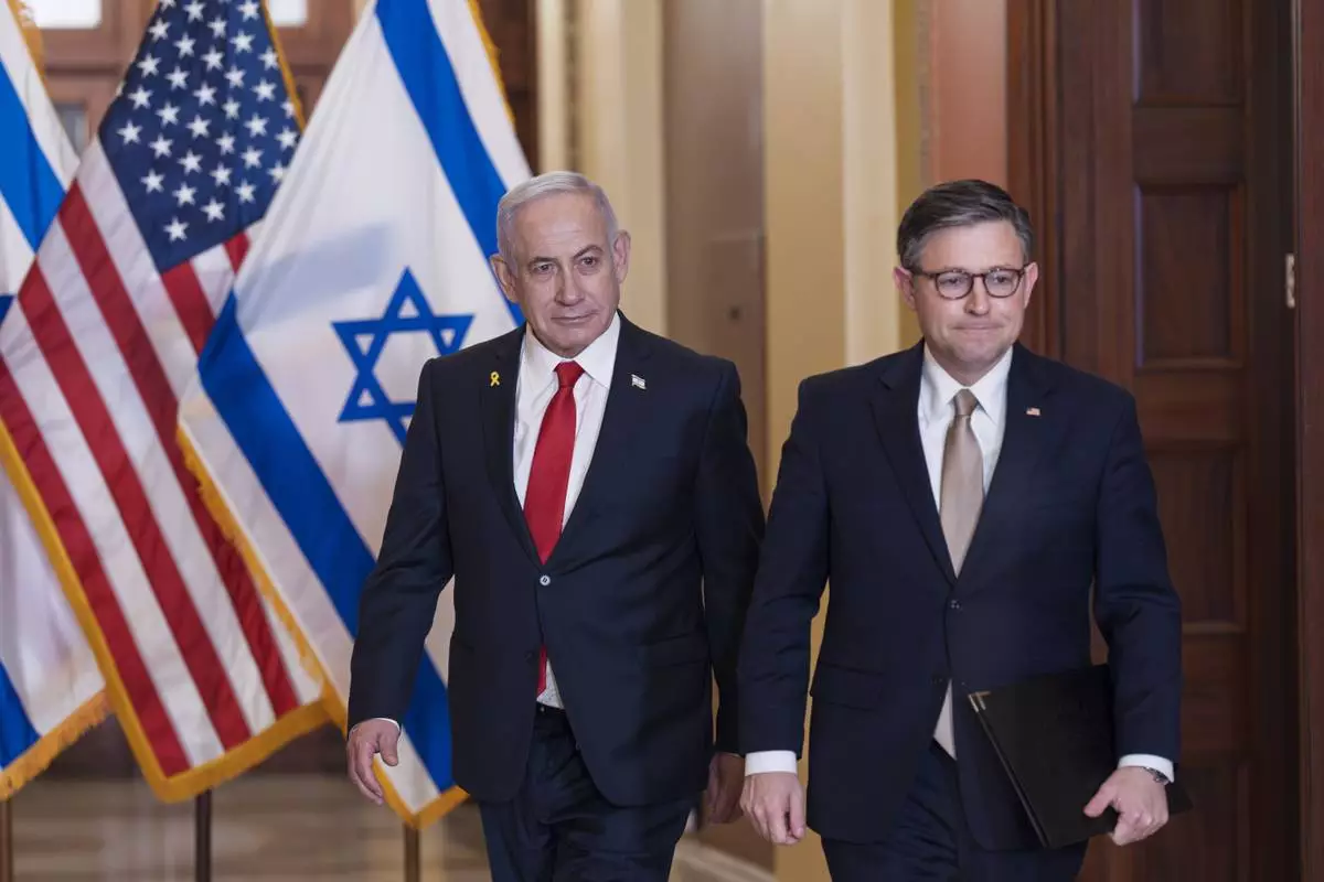 Israeli Prime Minister Benjamin Netanyahu, left, and Speaker of the House Mike Johnson, R-La., emerge from a meeting at the Capitol in Washington, Thursday, Feb. 7, 2025. (AP Photo/J. Scott Applewhite)