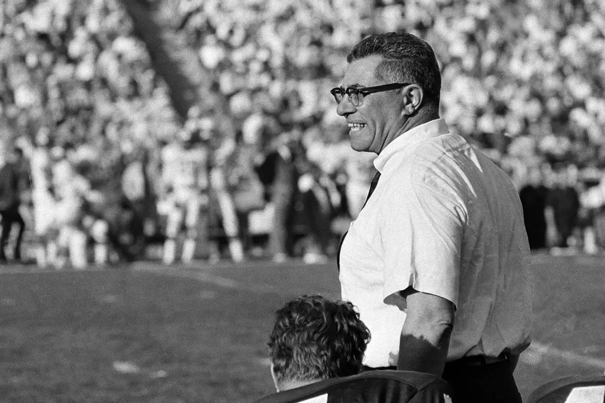 FILE_ Green Bay Packers coach Vince Lombardi cheers on his champion team as they swamp the Kansas City Chiefs during Super Bowl I in Los Angeles, Calif., Jan. 15, 1967. (AP Photo/File)