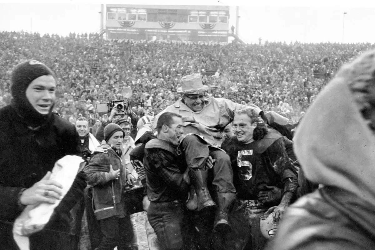 FILE - Green Bay Packers coach Vince Lombardi is carried off Lambeau Field on the shoulders of fullback Jimmy Taylor, left, and Paul Hornung after winning the NFL championship when they defeated the Cleveland Browns 23-12 in Green Bay, Wis., on Jan. 2, 1966. (AP Photo/File)