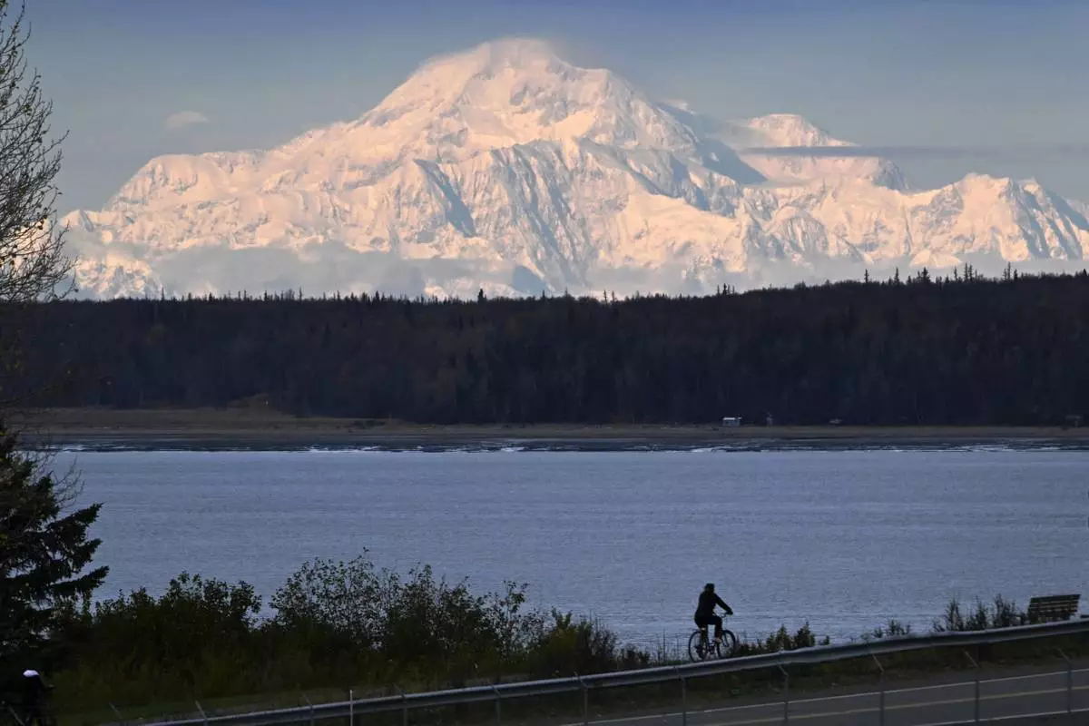 Denali is visible from Pt. Woronzof, Oct. 9, 2024, as a person rides a bicycle on the Tony Knowles Coastal Trail. (Bill Roth/Anchorage Daily News via AP)