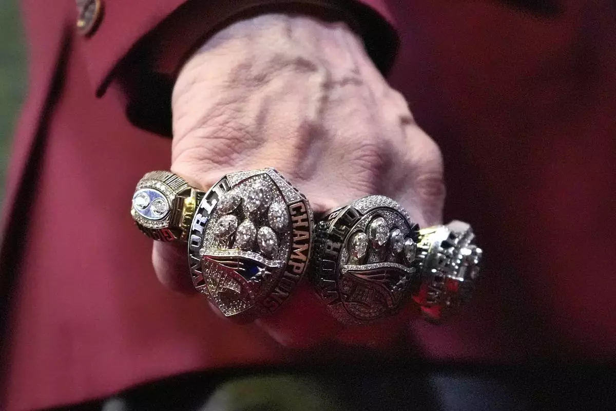 Former NFL head coach Bill Belichick shows his Super Bowl rings as he walks the red carpet at the NFL Honors award show ahead of the Super Bowl 59 football game, Thursday, Feb. 6, 2025, in New Orleans. (AP Photo/Brynn Anderson)