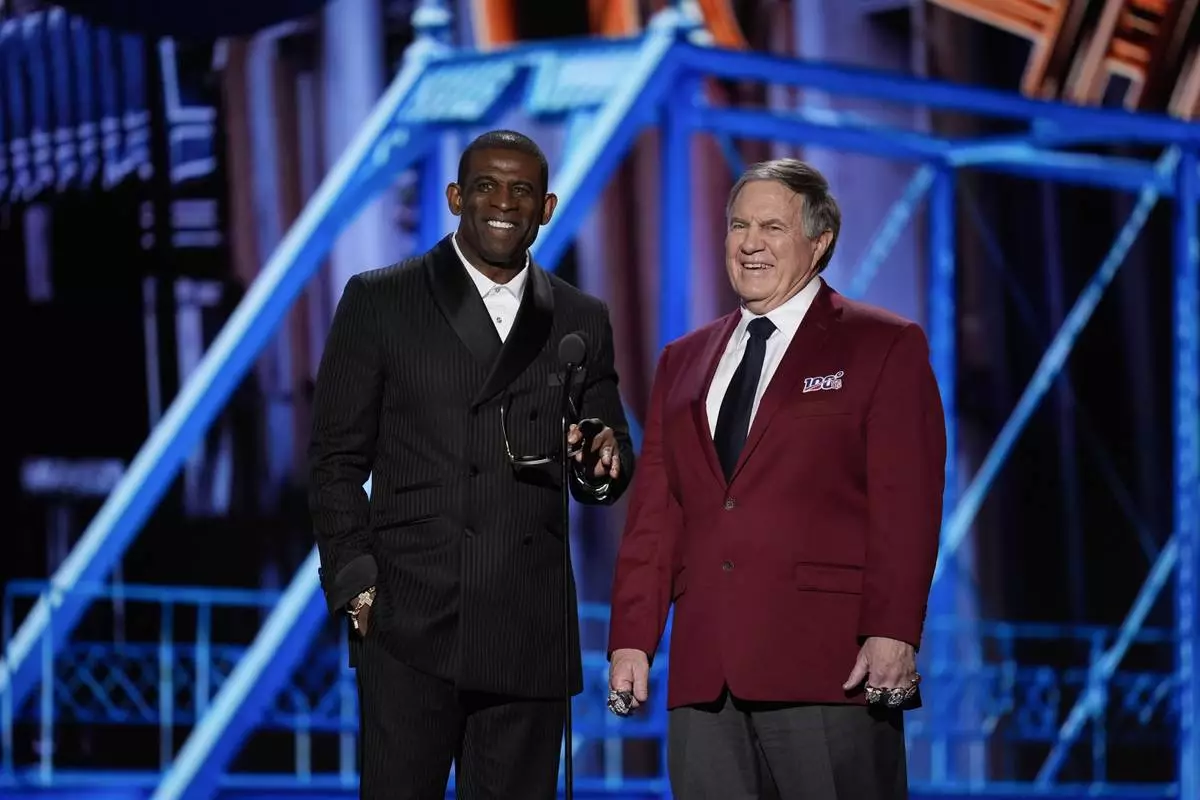 Coaches Deion Sanders, left, and Bill Belichick, right present the Coach of the year award during the NFL Honors award show ahead of the Super Bowl 59 football game, Thursday, Feb. 6, 2025, in New Orleans. (AP Photo/David J. Phillip)