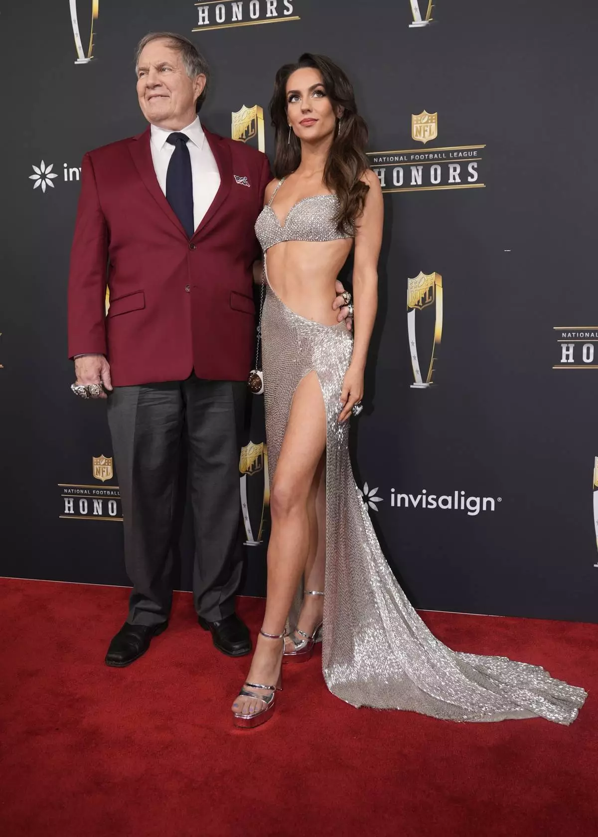 Former NFL head coach Bill Belichick and girlfriend Jordon Hudson, pose on the red carpet at the NFL Honors award show ahead of the Super Bowl 59 football game, Thursday, Feb. 6, 2025, in New Orleans. (AP Photo/Gerald Herbert)
