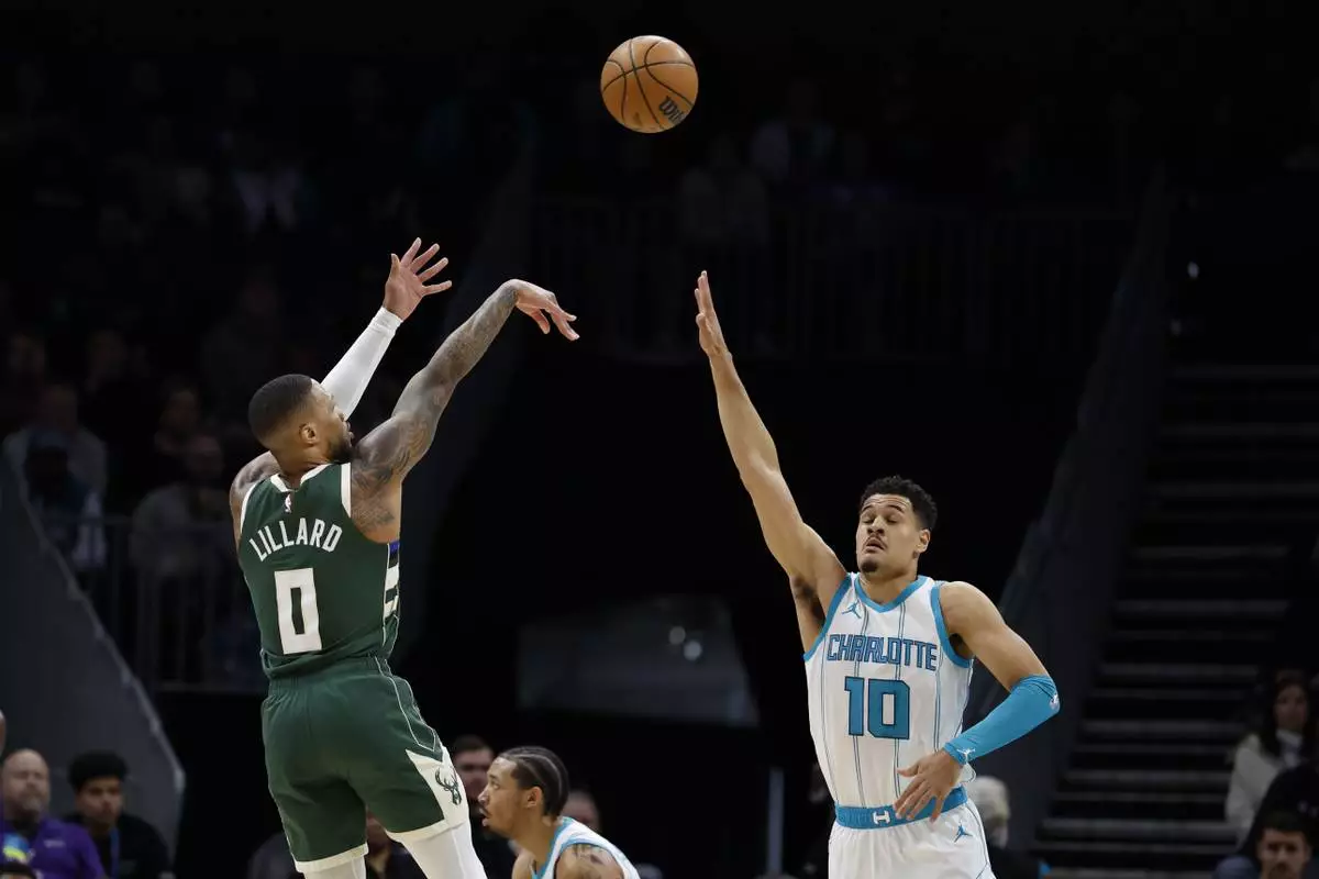 Milwaukee Bucks guard Damian Lillard (0) shoots over Charlotte Hornets guard Josh Green during the first half of an NBA basketball game in Charlotte, N.C., Wednesday, Feb. 5, 2025. (AP Photo/Nell Redmond)