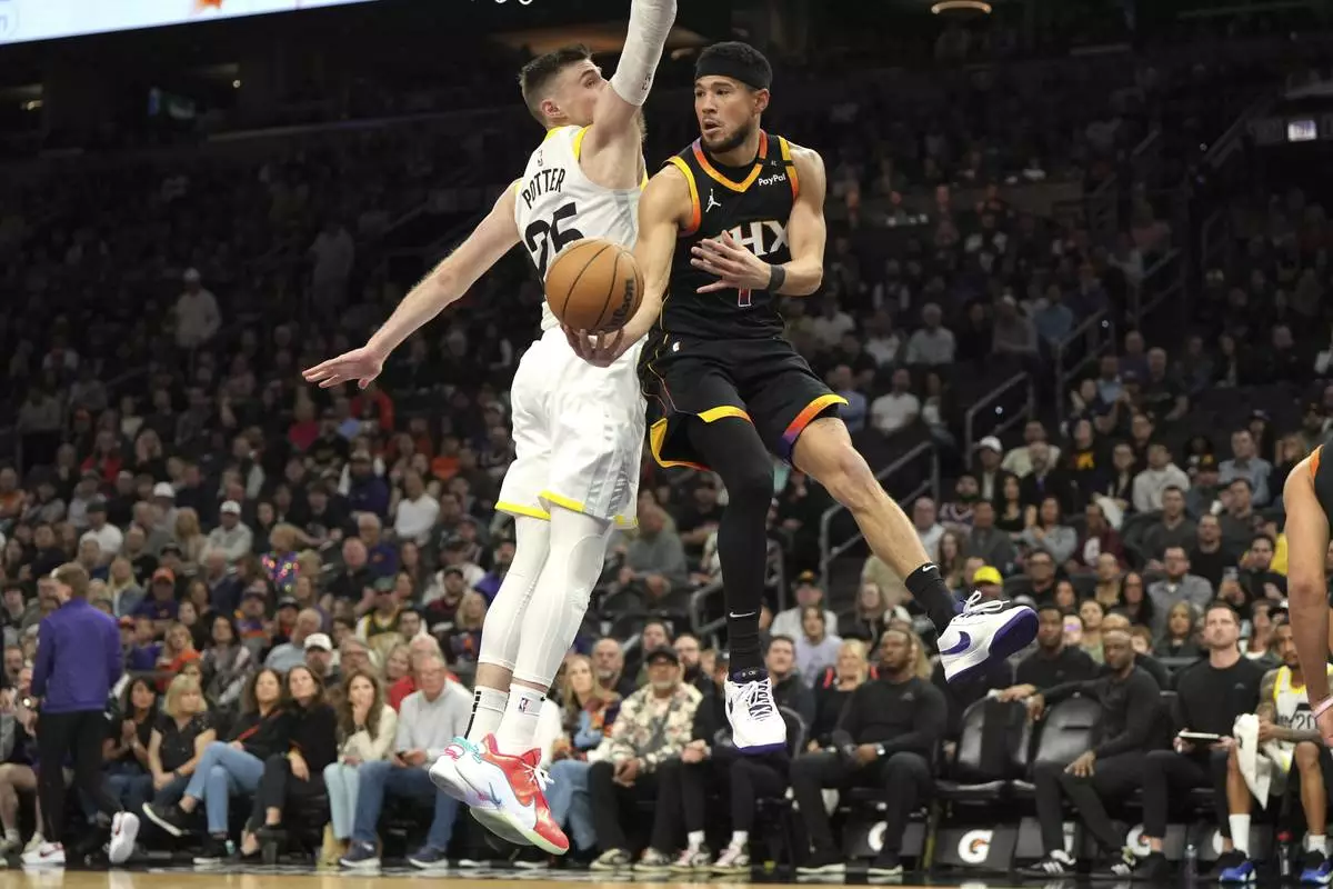 Phoenix Suns guard Devin Booker (1) makes the pass around Utah Jazz center Micah Potter during the first half of an NBA basketball game, Friday, Feb. 7, 2025, in Phoenix. (AP Photo/Rick Scuteri)