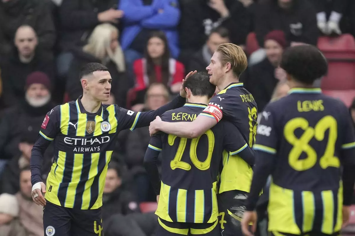 Manchester City players celebrate after Manchester City's Kevin De Bruyne, second right, scored his side's second goal during the English FA Cup fourth round soccer match between Leyton Orient and Manchester City at the Gaughan Group Stadium in London, England, Saturday, Feb. 8, 2025. (AP Photo/Kin Cheung)