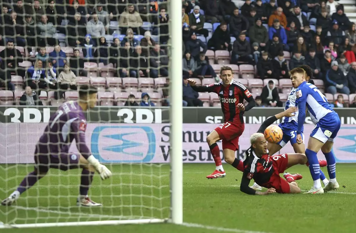 Wigan Athletic's Luke Robinson, right, scores an own goal during the Englsih FA Cup fourth round soccer match between Wigan Athletic and Fulham at The Brick Community Stadium, Wigan, England, Saturday Feb. 8, 2025. (Barrington Coombs/PA via AP)