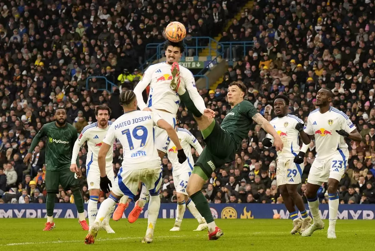 Leeds United's Pascal Struijk, top center, and Millwall's Jake Cooper, center right, battle for the ball during the English FA Cup fourth round soccer match at Elland Road, Leeds, England, Saturday, Feb. 8, 2025. (Danny Lawson/PA via AP)