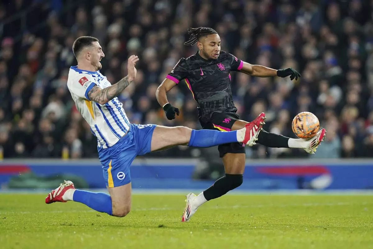 Brighton and Hove Albion's Lewis Dunk, left, and Chelsea's Christopher Nkunku battle for the ball during the English FA Cup fourth round soccer match between Brighton & Hove Albion and Chelsea at American Express Stadium, Brighton, England, Saturday Feb. 8, 2025. (Gareth Fuller/PA via AP)