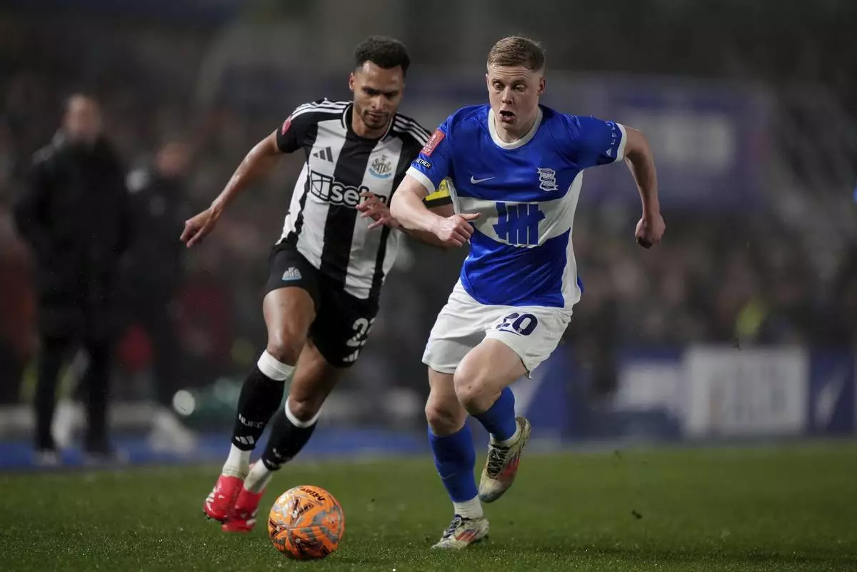 Newcastle United's Jacob Murphy, left, and Birmingham City's Alex Cochrane in action during the English FA Cup fourth round soccer match between Birmingham City and Newcastle United at in Birmingham, England, Saturday Feb. 8, 2025. (Bradley Collyer/PA via AP)