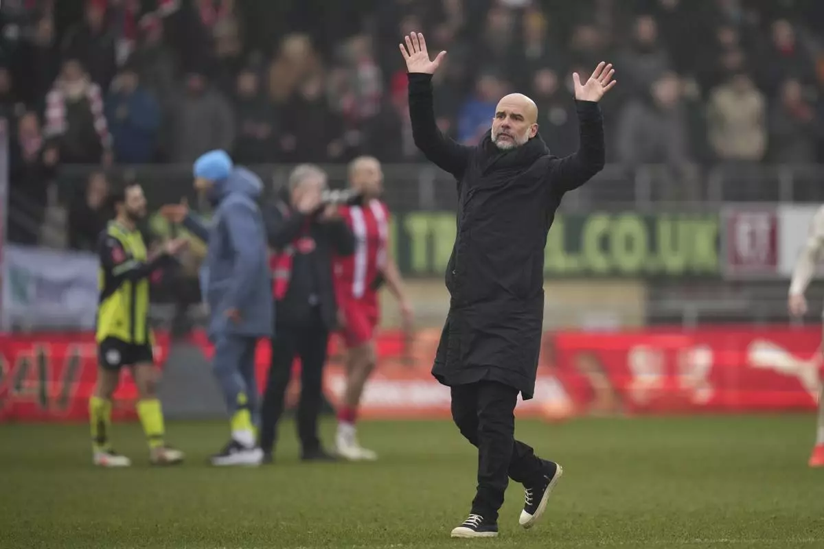 Manchester City's head coach Pep Guardiola celebrates at the end of the English FA Cup fourth round soccer match between Leyton Orient and Manchester City at the Gaughan Group Stadium in London, England, Saturday, Feb. 8, 2025. (AP Photo/Kin Cheung)