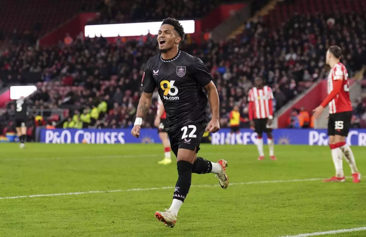 Burnley's Marcus Edwards celebrates scoring during the English FA Cup fourth round soccer match between Southampton and Burnley at St Mary's Stadium, Southampton, England, Saturday Feb. 8, 2025. (John Walton/PA via AP)