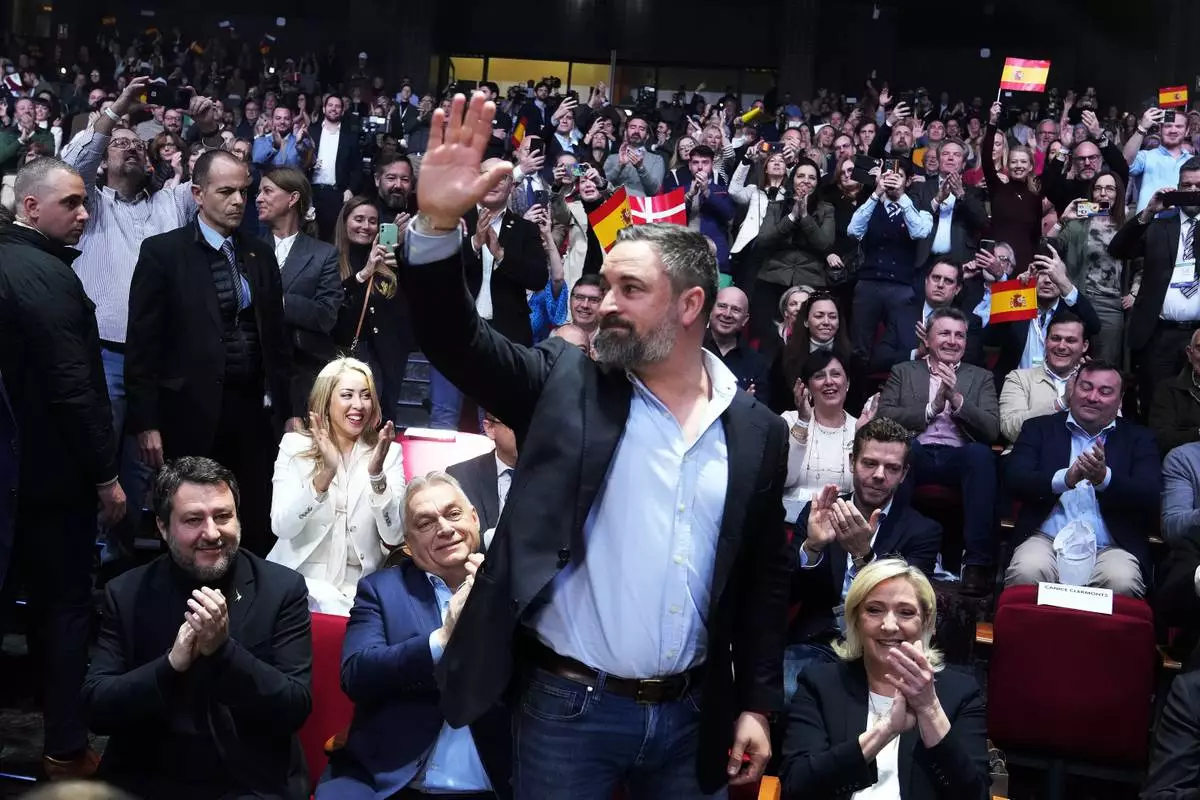 Spanish far-right VOX party leader Santiago Abascal, centre, waves next to European far-right politicians during the Patriots for Europe summit in Madrid, Spain, Saturday, Feb. 8, 2025. Front row from left, Italy's vice Premier Matteo Salvini, Hungarian Prime Minister Viktor Orban, far-right VOX party leader Santiago Abascal, French far-right leader Marine Le Pen and Dutch far right wing politician Geert Wilders.(AP Photo/Paul White)