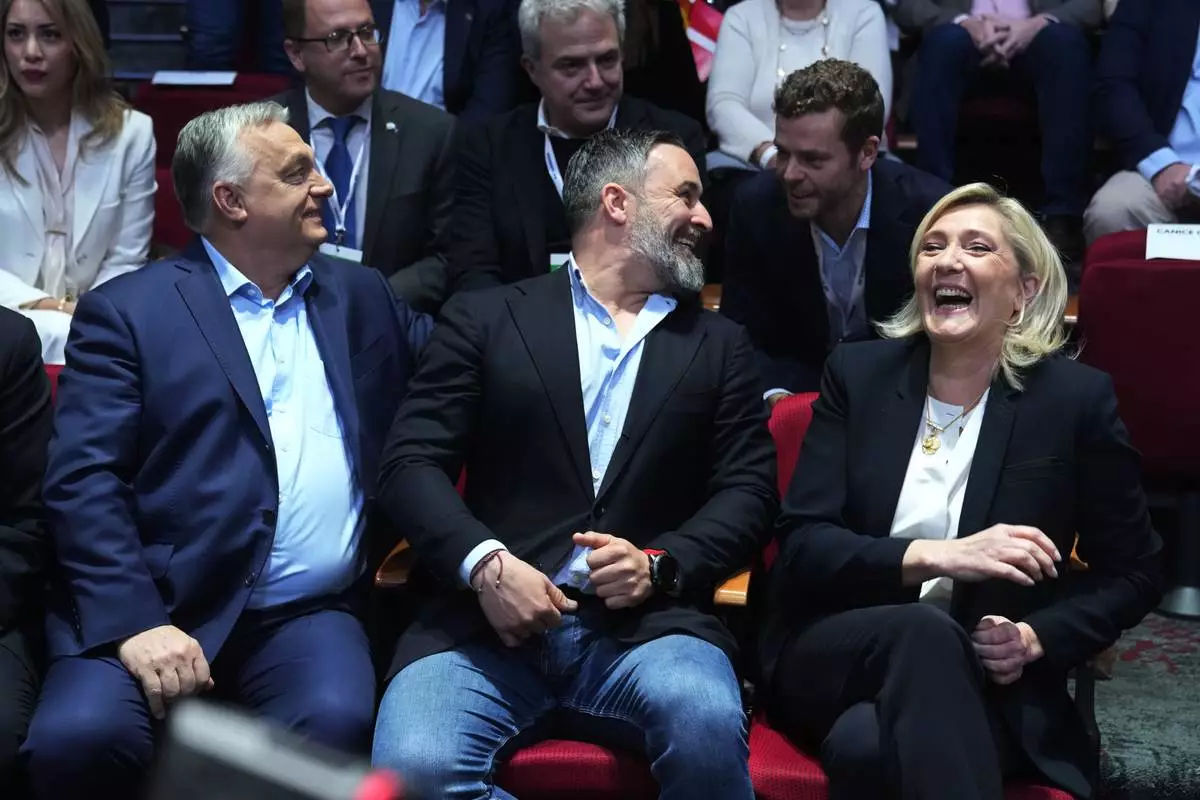 Hungarian Prime Minister Viktor Orban, left, far-right VOX party leader Santiago Abascal, centre and French far-right leader Marine Le Pen take part in the Patriots for Europe summit in Madrid, Spain, Saturday, Feb. 8, 2025. AP Photo/Paul White)