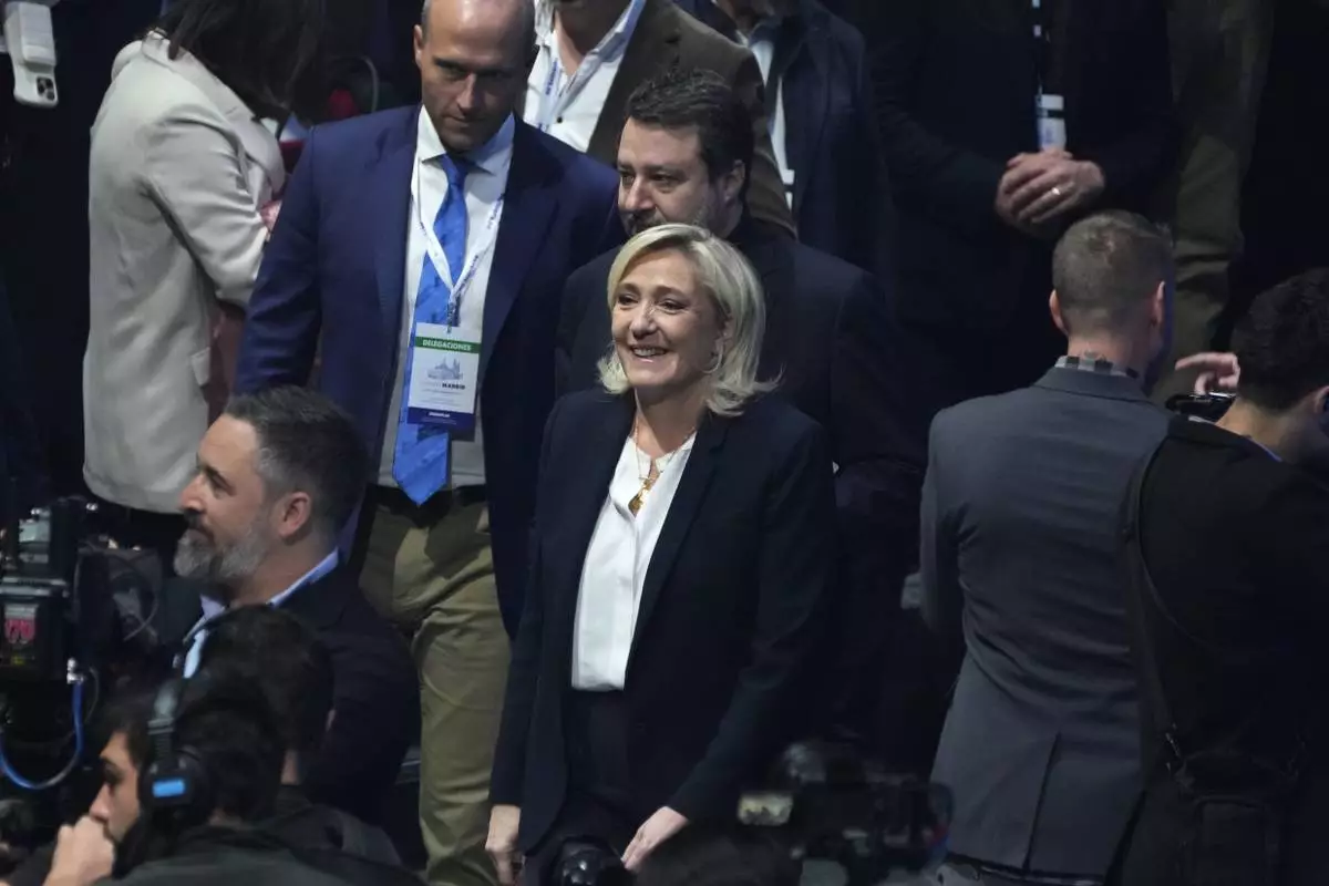 French far-right leader Marine Le Pen, centre, arrives with far-right VOX party leader Santiago Abascal, left and Italy's vice Premier Matteo Salvini, centre top at the Patriots for Europe summit in Madrid, Spain, Saturday, Feb. 8, 2025. AP Photo/Paul White)